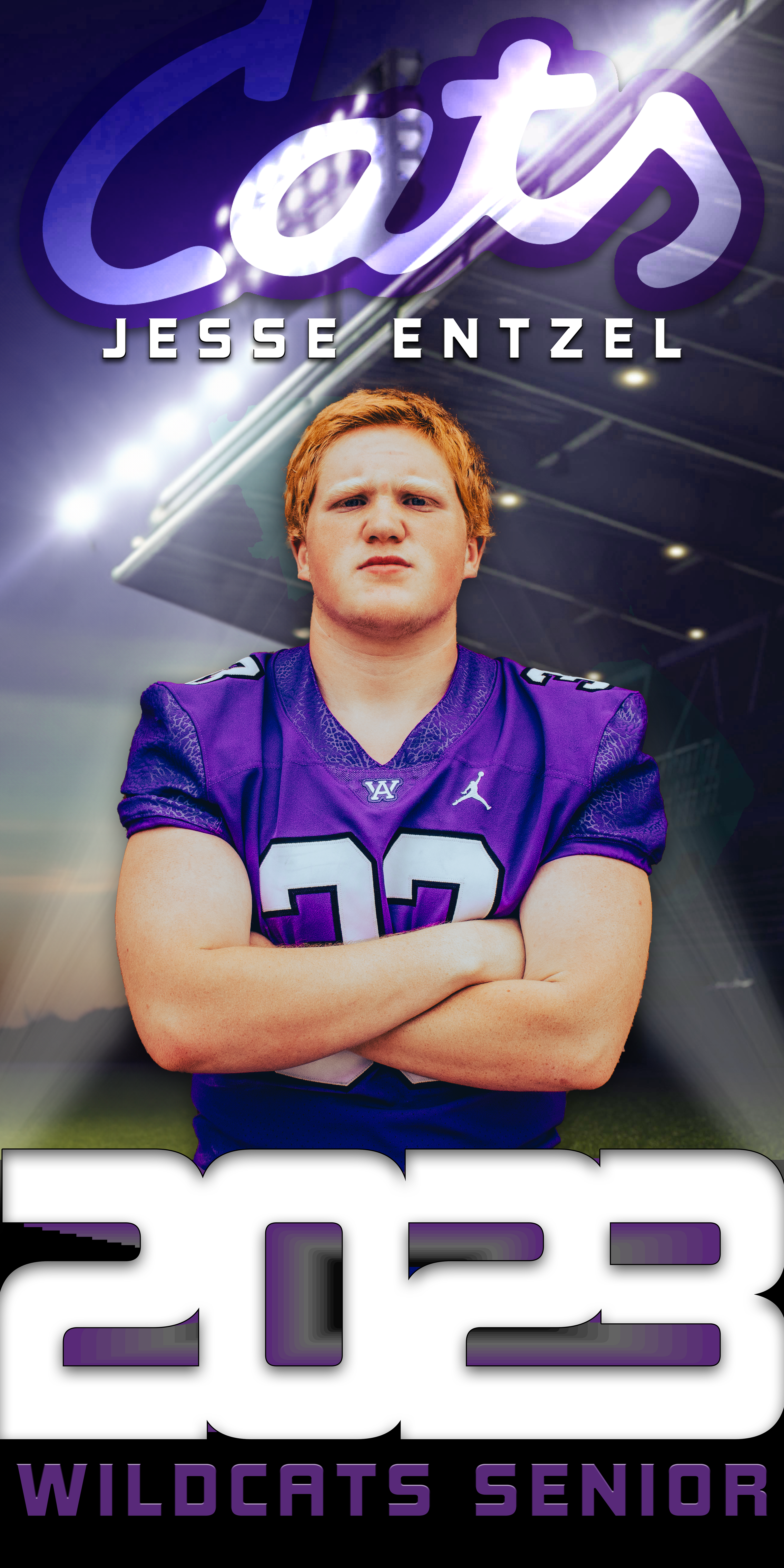 The core objective was to create a visually striking, professional, and print-ready template suitable for large-format display. I started by integrating the Wildcats’ established purple, white, and black branding into a dynamic design featuring a stadium background and strong typography, ensuring the final graphic was both celebratory and cohesive across the entire team set. The design prominently features the player’s portrait, name, number, and graduation year (2023) using layered visual effects to achieve maximum dramatic appeal.